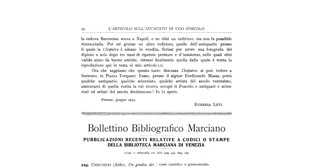 Eu estava já terminando de escrever este artigo, quando, em um último afã de obter mais alguma informação sobre o paradeiro deste suposto retrato de Cleópatra, que tanto eletrizou a comunidade artística e científica durante boa parte do século XIX, deparei-me com a já mencionada cópia do artigo da escritora italiana Eugenia Levi, publicado em 1913 (La Bibliofilía, Vol. 15, No. 2/3 (Maggio-Giugno 1913), pp. 68-90, pela Casa Editrice Leo S. Olschki s.r.l..