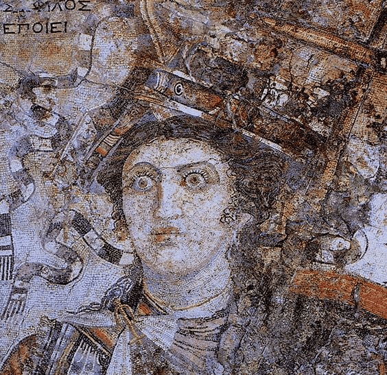 Assim, uma pintura como a de Cleópatra, ostentando a coroa radiada (sinal de divindade) e trazendo a serpente enrolada no braço (para os cristãos da época, um símbolo do Diabo), poderia muito bem ter sido percebida como um ídolo pagão e destruída em pedaços, assim que esses fanáticos religiosos tiveram acesso à Vila de Adriano, que já devia estar abandonada no século V D.C.