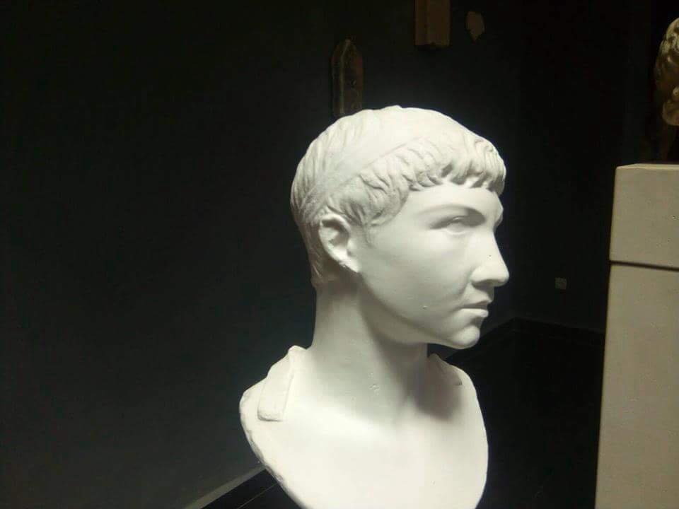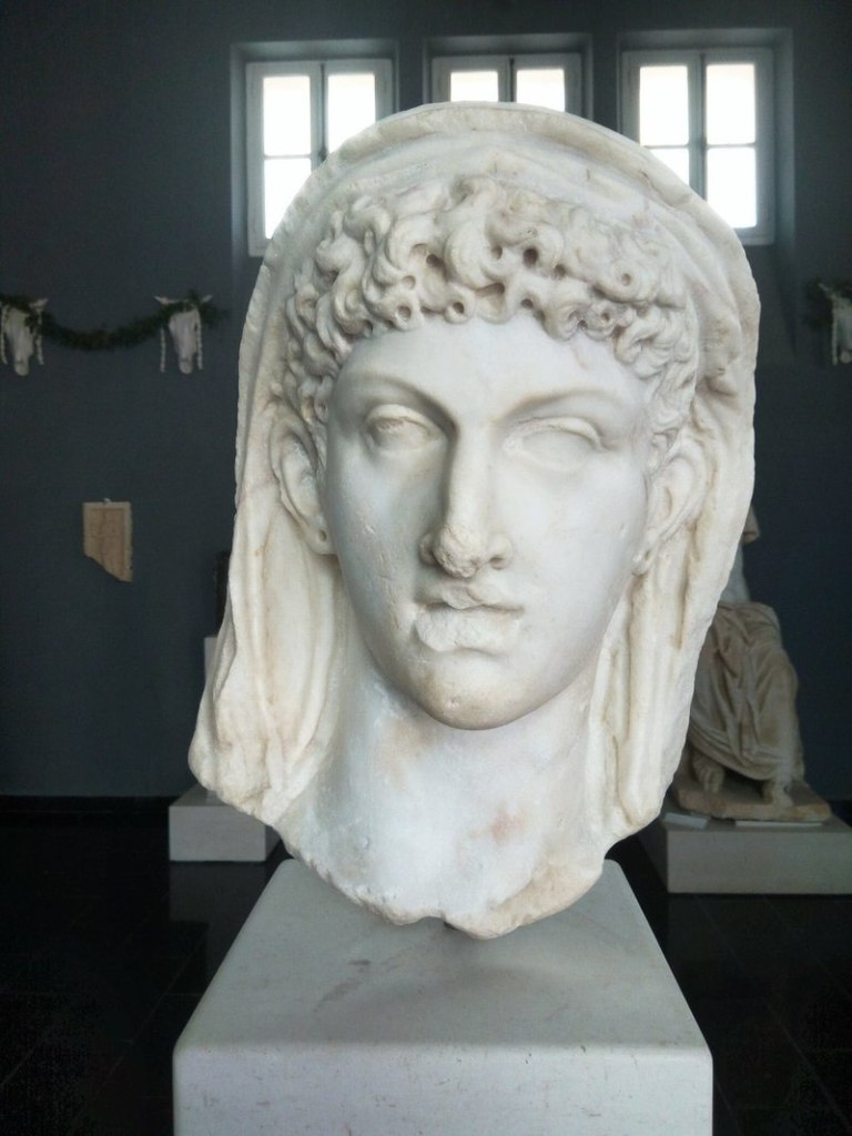 A cabeça de mármore abaixo foi descoberta no ano de 1784 nas ruínas da Villa dos Quintílios, na Via Ápia, em Roma, e estima-se que seja datada entre 40 A.C e 30 A.C, encontrando-se atualmente no Museo Gregoriano Profano, integrante dos Museus Vaticanos. Ela ostenta o penteado estilo melão, o coque e a tiara da realeza ptolomaica, esta com um detalhe que pode ser uma pedra preciosa (falaremos sobre isso mais adiante) ou talvez seja o resto de uma serpente (ureaus, ornamento característico dos faraós). Infelizmente, o nariz da escultura foi danificado, de forma intencional, provavelmente, e se perdeu.