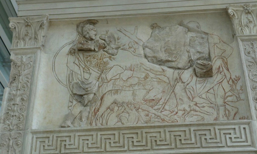 Fragmentos do relevo reconstituído da fachada da Ara Pacis, mostrando cena relacionadas com lenda de Rômulo e Remo, que estão sendo amamentados pela loba na Lupercal. Foto: Amphipolis, CC BY-SA 2.0 https://creativecommons.org/licenses/by-sa/2.0, via Wikimedia Commons